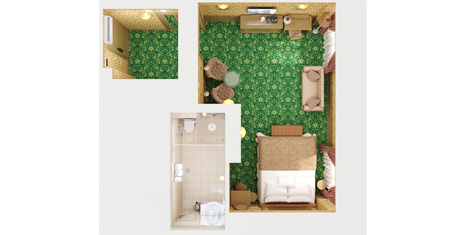Номер общей площадью 43 м2, состоящий из уютной гостиной с раскладным диваном и просторной спальни с двуспальной кроватью (180х200) / двумя раздельными кроватями (90х200), оборудованный кондиционером.
